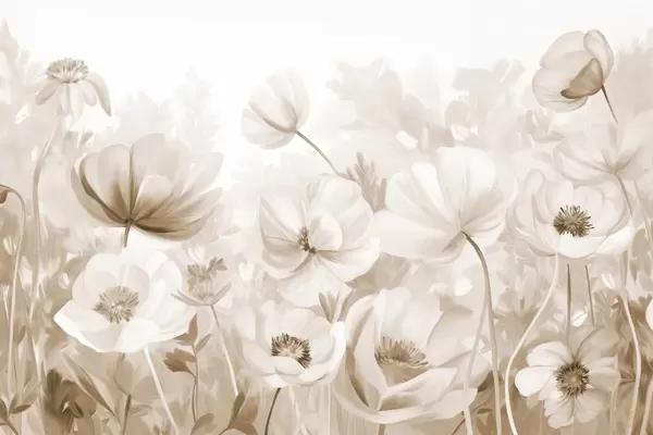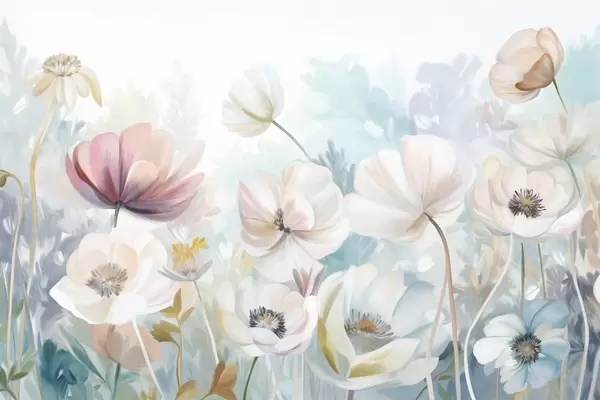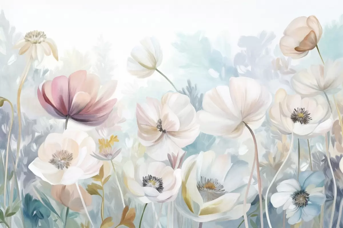 Τοιχογραφίες Ένα λιβάδι με παστέλ χρώματα λουλούδια με λεπτεπίλεπτα πέταλα, απαλά πράσινα φύλλα, σε ένα ονειρικό, υφασμάτινο στυλ ακουαρέλας Nr. w09481