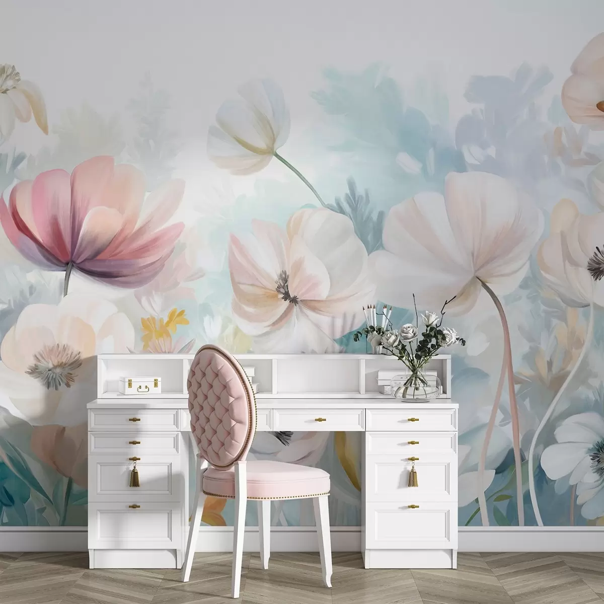 Τοιχογραφίες Ένα λιβάδι με παστέλ χρώματα λουλούδια με λεπτεπίλεπτα πέταλα, απαλά πράσινα φύλλα, σε ένα ονειρικό, υφασμάτινο στυλ ακουαρέλας Nr. w09481