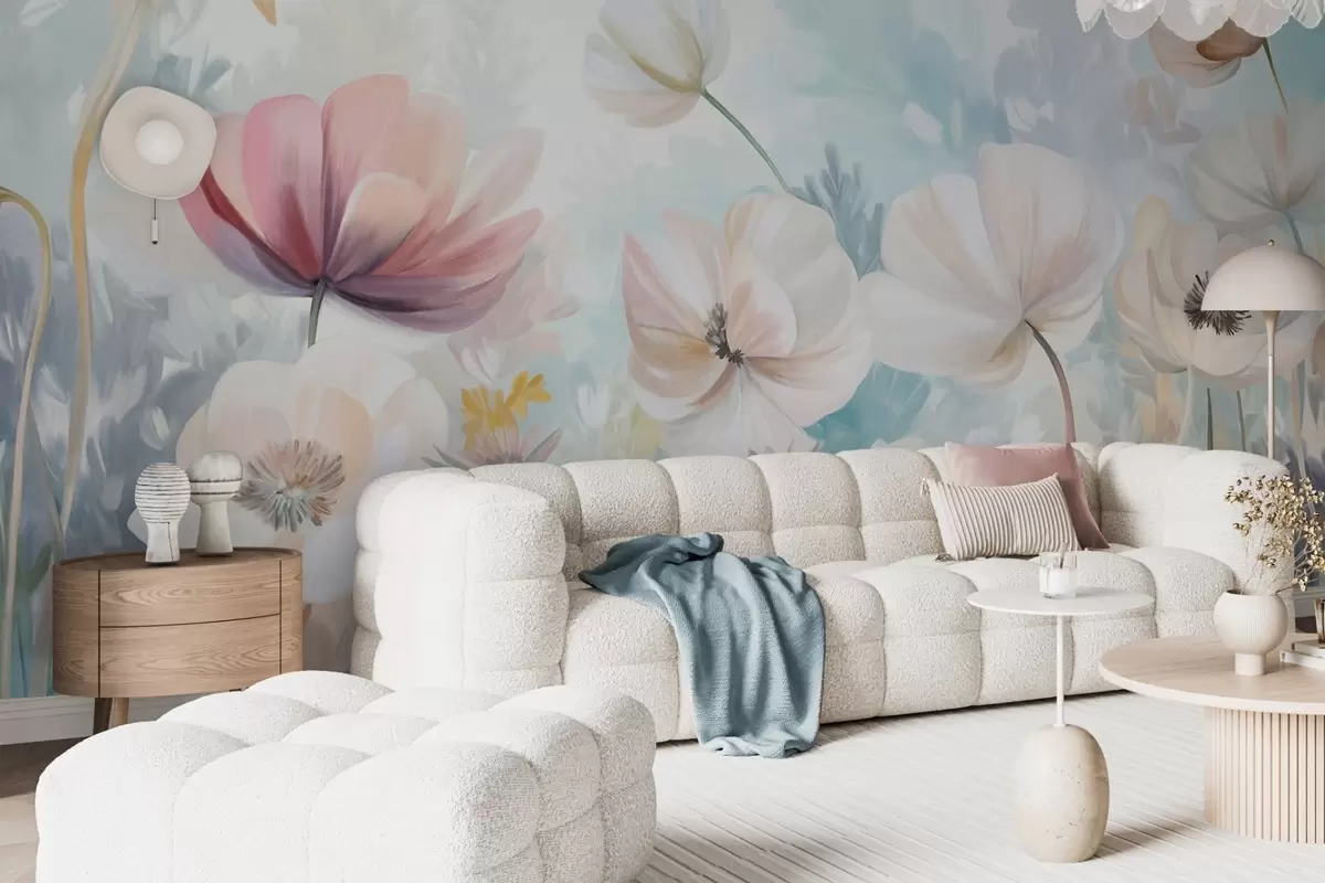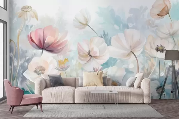 Τοιχογραφίες Ένα λιβάδι με παστέλ χρώματα λουλούδια με λεπτεπίλεπτα πέταλα, απαλά πράσινα φύλλα, σε ένα ονειρικό, υφασμάτινο στυλ ακουαρέλας Nr. w09481