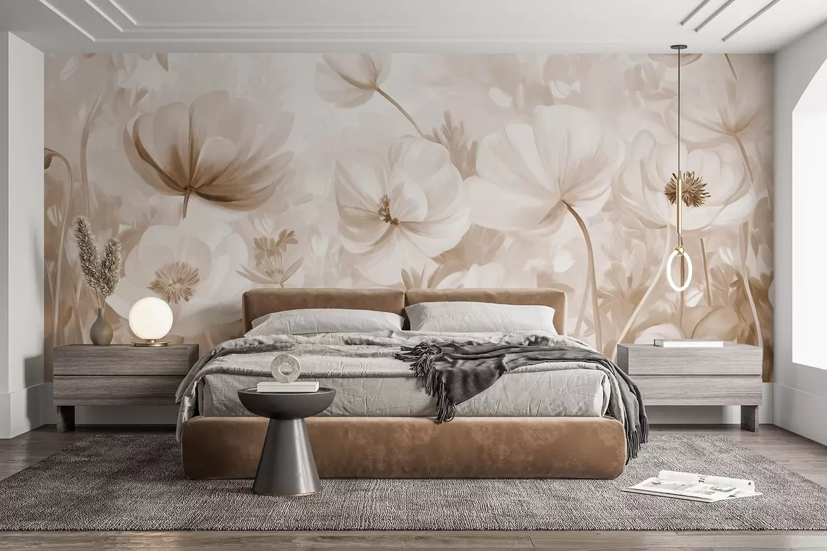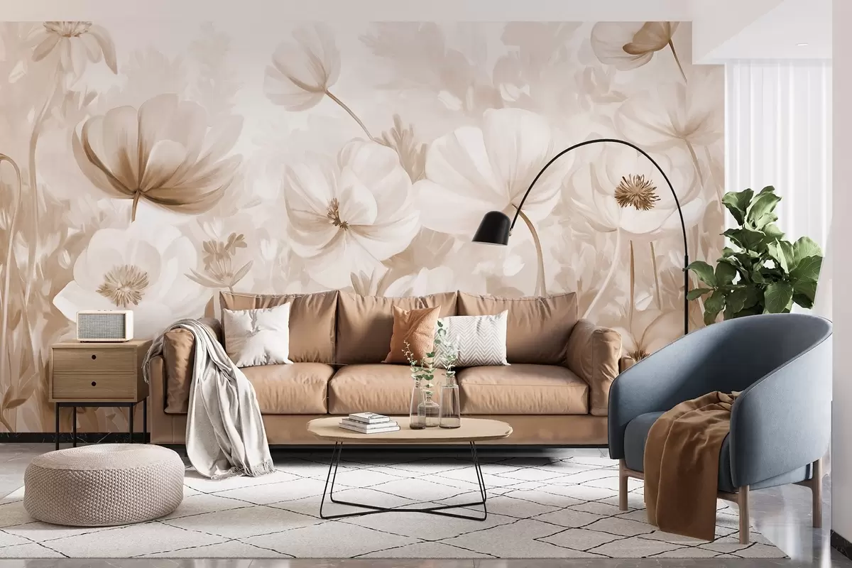 Τοιχογραφίες Ένα πεδίο με μπεζ λουλούδια με λεπτεπίλεπτα πέταλα, απαλά καφέ φύλλα, σε ένα ονειρικό, υφασμάτινο στυλ ακουαρέλας Nr. w09481v1