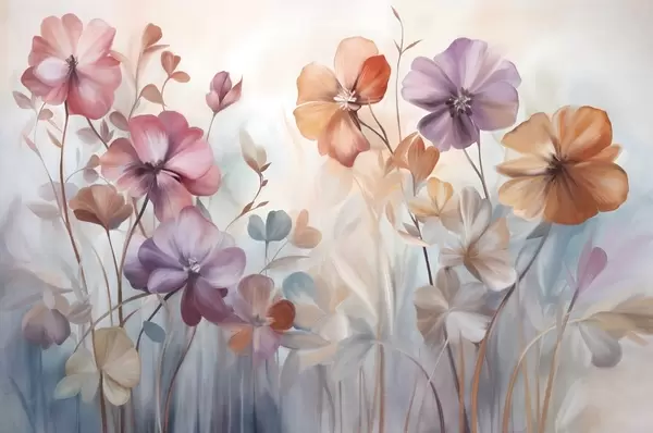 Τοιχογραφίες Υφασμάτινη ανθοσύνθεση με ροζ, μοβ και πορτοκαλί λουλούδια με πράσινα στελέχη και φύλλα, απαλά παστέλ χρώματα Nr. w09486