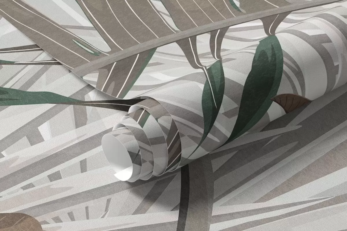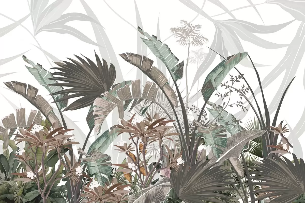 Τοιχογραφίες Τροπικά φύλλα με υφή και λουλούδια, φοίνικες, λουλούδια πλουμέρια, παστέλ χρώματα, λευκό φόντο, ζούγκλα Nr. w09488