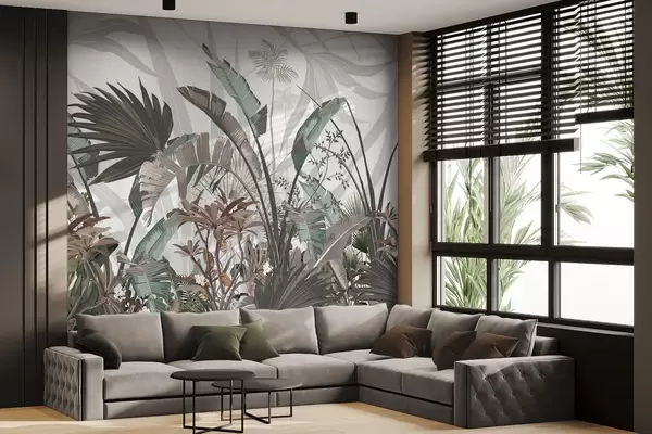 Τοιχογραφίες Τροπικά φύλλα με υφή και λουλούδια, φοίνικες, λουλούδια πλουμέρια, παστέλ χρώματα, λευκό φόντο, ζούγκλα Nr. w09488