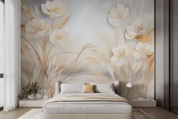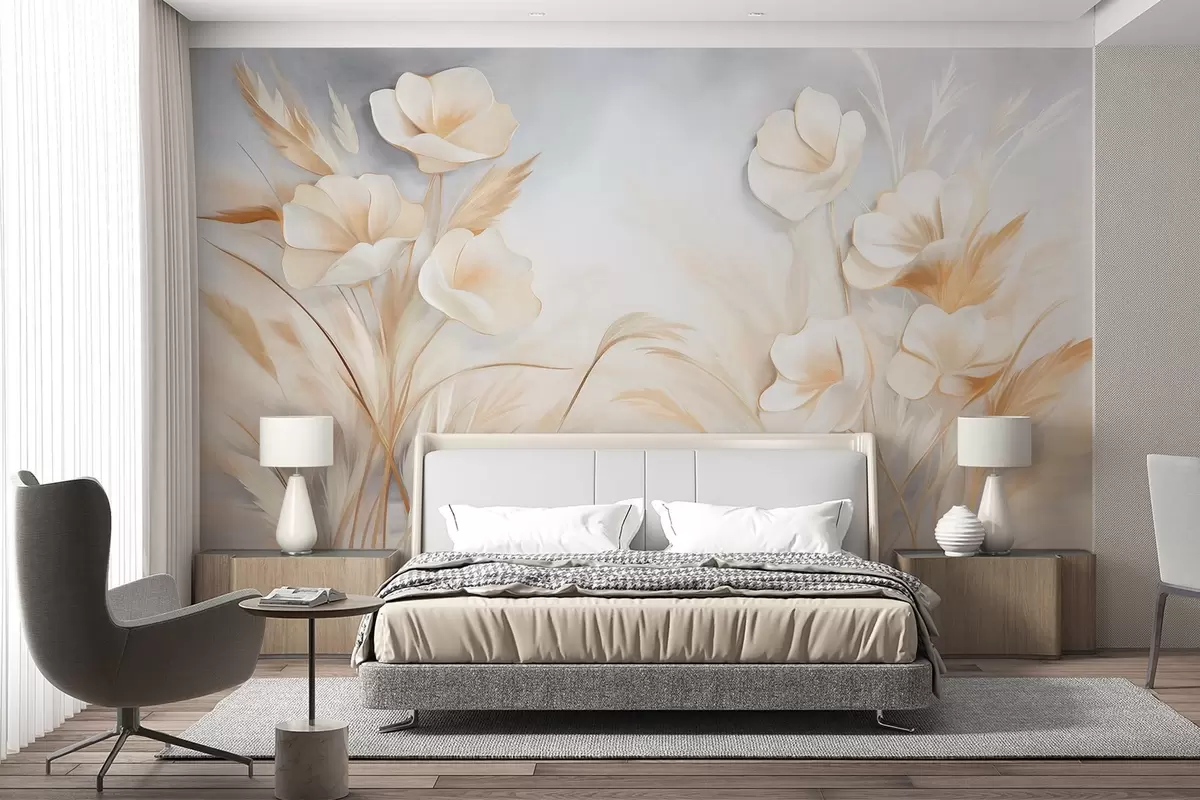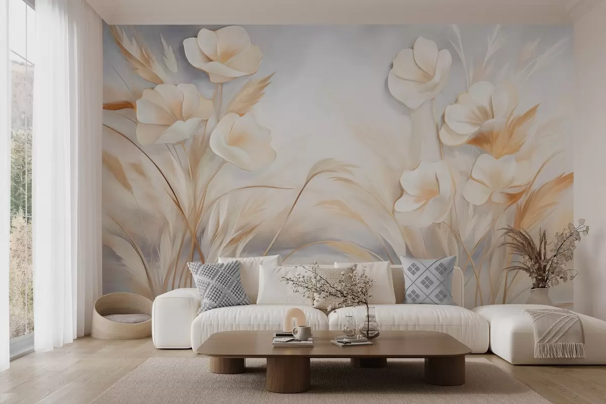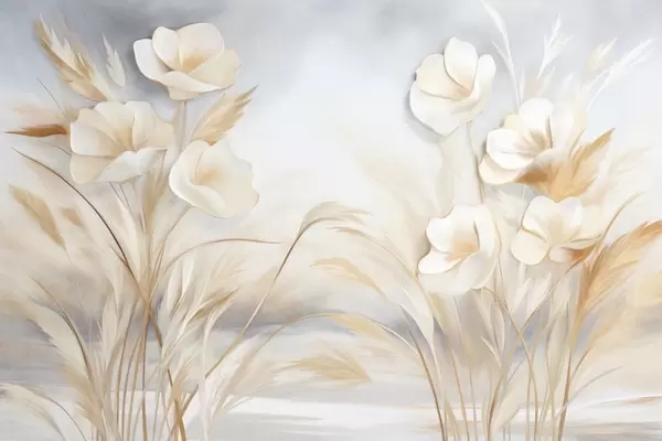 Τοιχογραφίες Λευκά λουλούδια, μπεζ καλάμια και χόρτα πάμπας, υφή, κομψό, μινιμαλιστικό στυλ, αφηρημένο φόντο τοπίου Nr. w09490