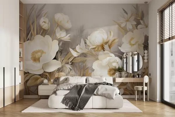 Τοιχογραφίες Λευκές και κίτρινες παιώνιες και άλλα λουλούδια με ψηλό χορτάρι και φύλλα σε απαλό, ζωγραφικό στυλ με υφή Nr. w09494