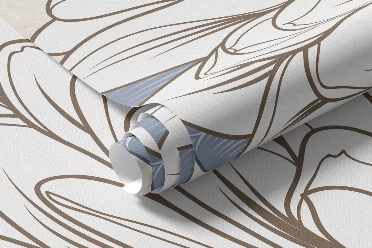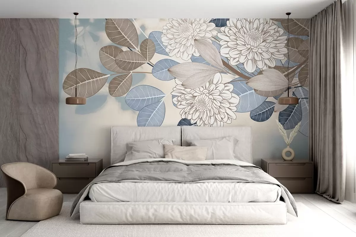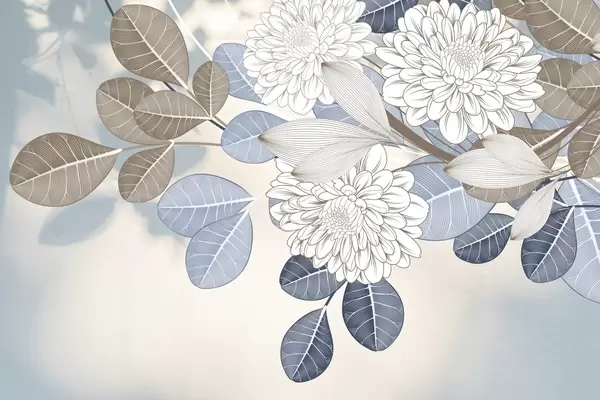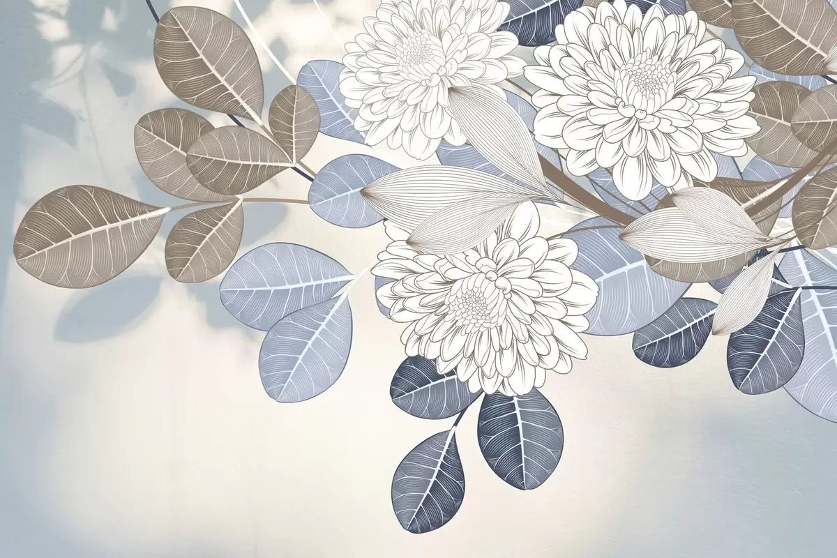 Τοιχογραφίες Λευκά λουλούδια με μπλε και καφέ φύλλα, ανοιχτό μπλε φόντο με υφή, ανθοσύνθεση, λεπτομερές σχέδιο με γραμμές Nr. w09496