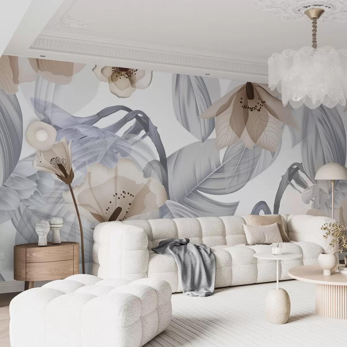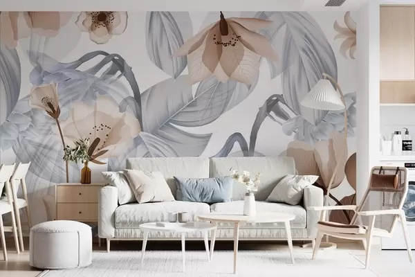 Τοιχογραφίες Καφέ λουλούδια και γκρι φύλλα, φόντο με βοτανικά μοτίβα, κομψό σχέδιο, απαλά χρώματα, ελαφριές λεπτομέρειες Nr. w09497v1