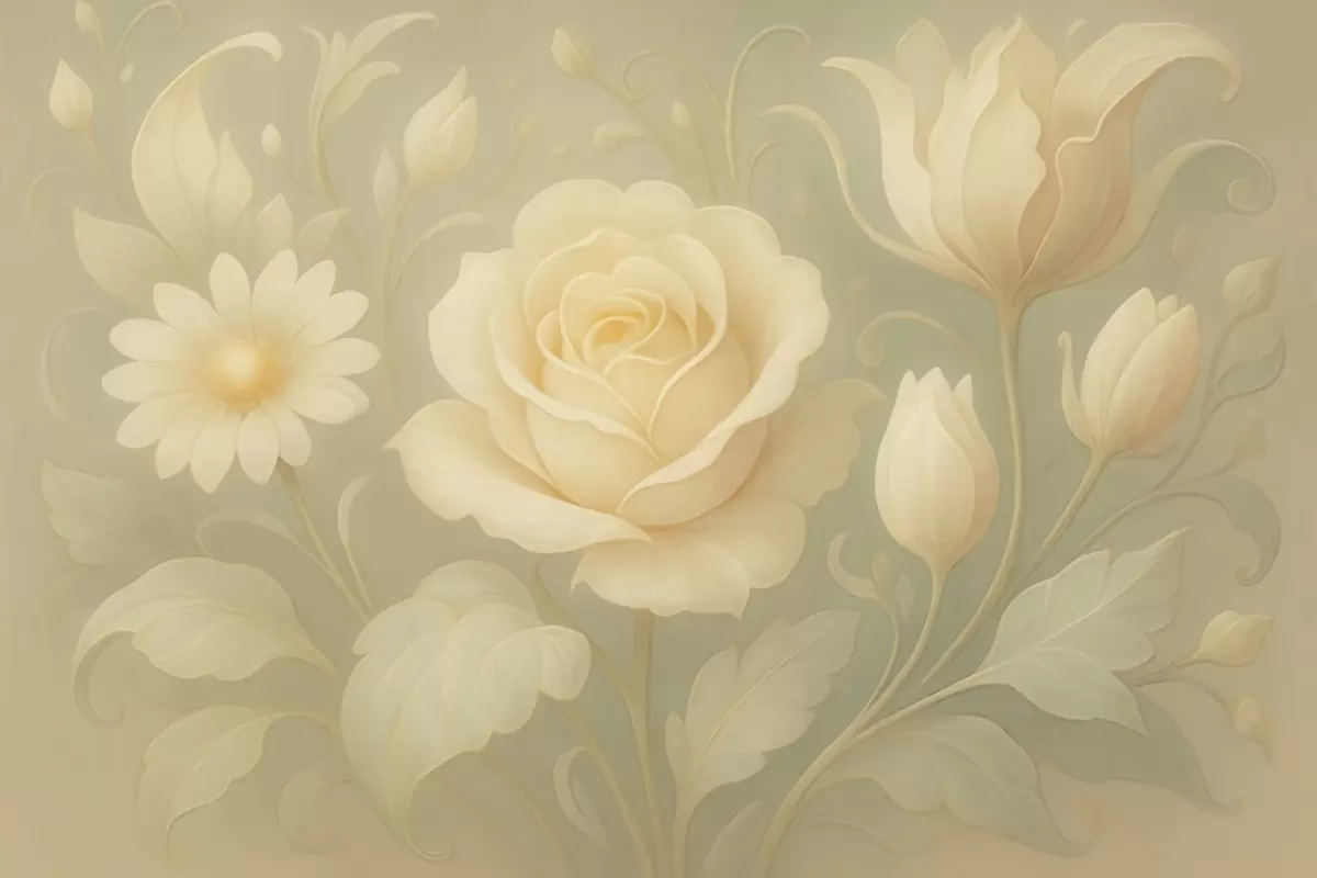 Τοιχογραφίες Λεπτή vintage σύνθεση με μπεζ τριαντάφυλλα σε ανοιχτό πράσινο φόντο Nr. w09499
