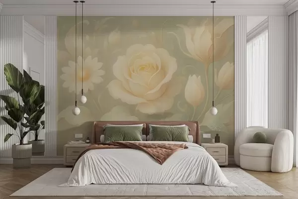 Τοιχογραφίες Λεπτή vintage σύνθεση με μπεζ τριαντάφυλλα σε ανοιχτό πράσινο φόντο Nr. w09499