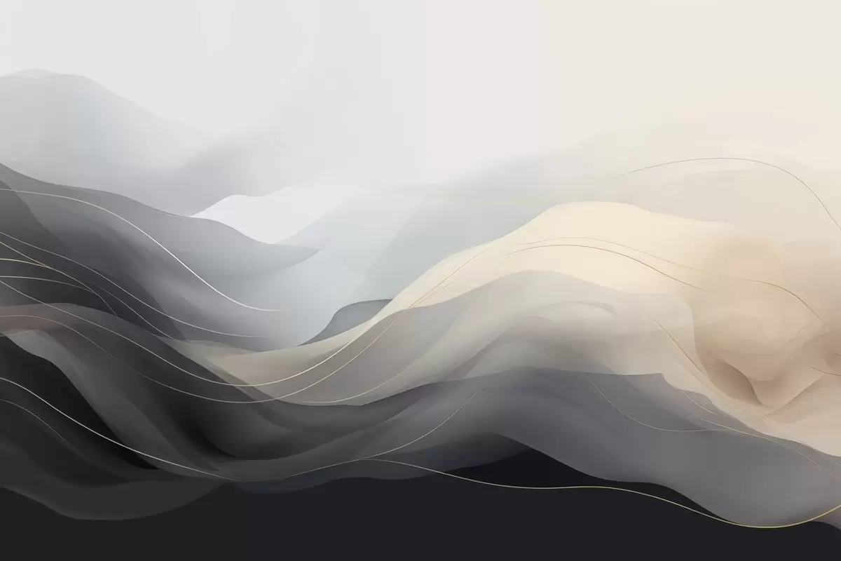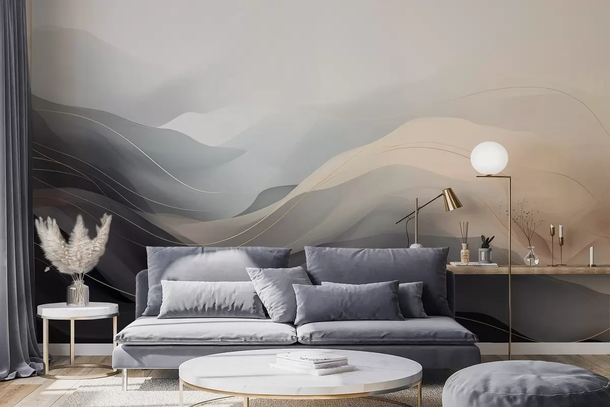 Τοιχογραφίες Αφηρημένα ομιχλώδη κύματα σε αποχρώσεις του γκρι-κρεμ με κίτρινες γραμμές Nr. w09504