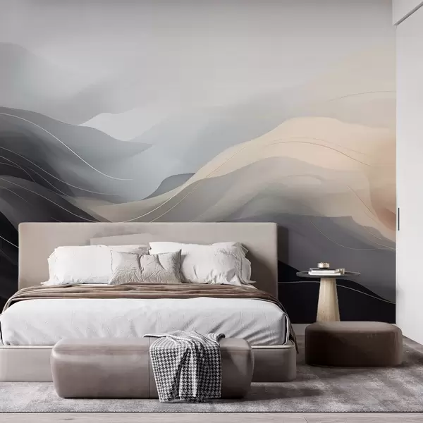 Τοιχογραφίες Αφηρημένα ομιχλώδη κύματα σε αποχρώσεις του γκρι-κρεμ με κίτρινες γραμμές Nr. w09504
