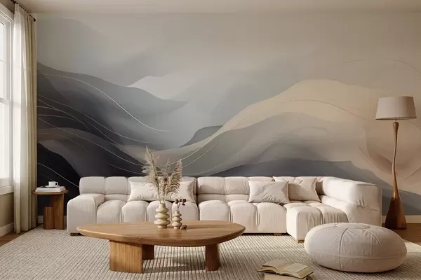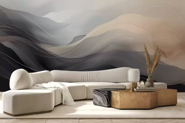 Τοιχογραφίες Αφηρημένα ομιχλώδη κύματα σε αποχρώσεις του γκρι-κρεμ με κίτρινες γραμμές Nr. w09504