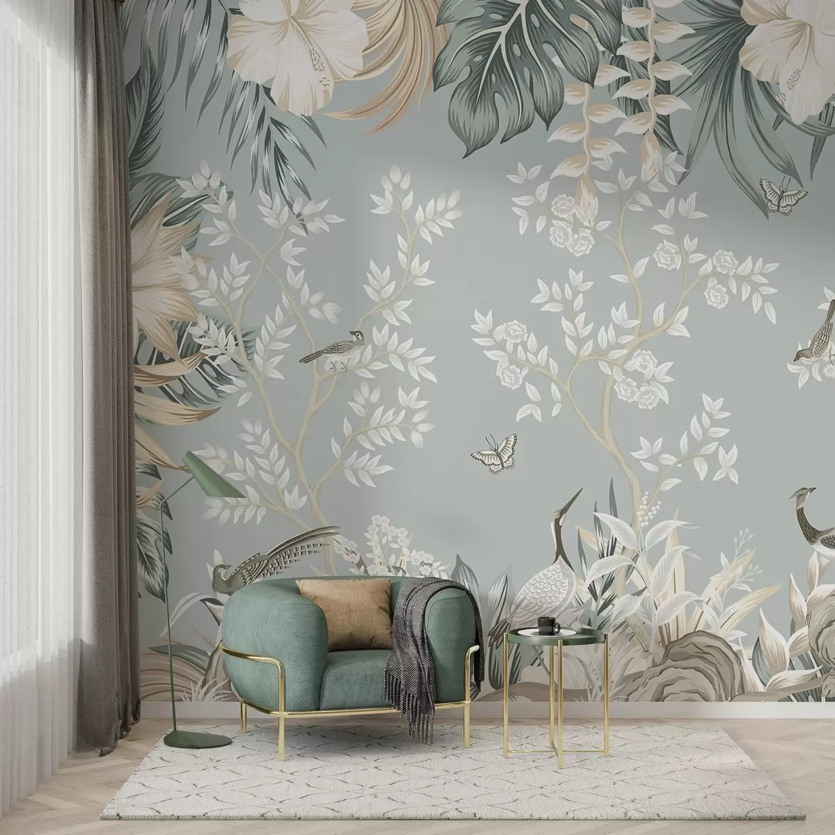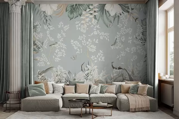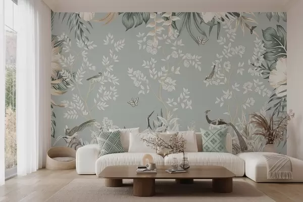 Τοιχογραφίες Τροπική παστέλ τέχνη με υφή, με πουλιά, πεταλούδες, λουλούδια ιβίσκου, φύλλα φοίνικα και δέντρα σε γαλάζιο φόντο Nr. w09528
