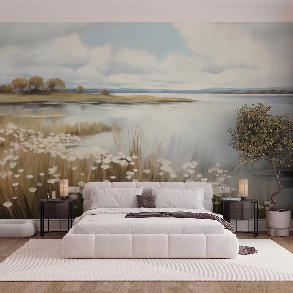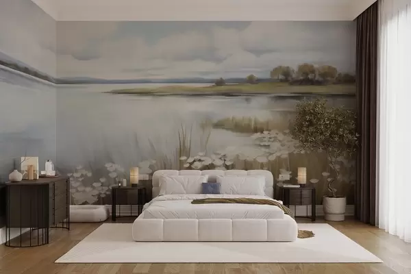 Τοιχογραφίες Υφή τοπίου, πεδίο με λευκά λουλούδια και ψηλό χορτάρι, λίμνη στο βάθος, λόφος με χορτάρι και δέντρα, απαλά χρώματα Nr. w09530