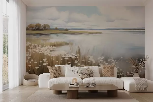 Τοιχογραφίες Υφή τοπίου, πεδίο με λευκά λουλούδια και ψηλό χορτάρι, λίμνη στο βάθος, λόφος με χορτάρι και δέντρα, απαλά χρώματα Nr. w09530