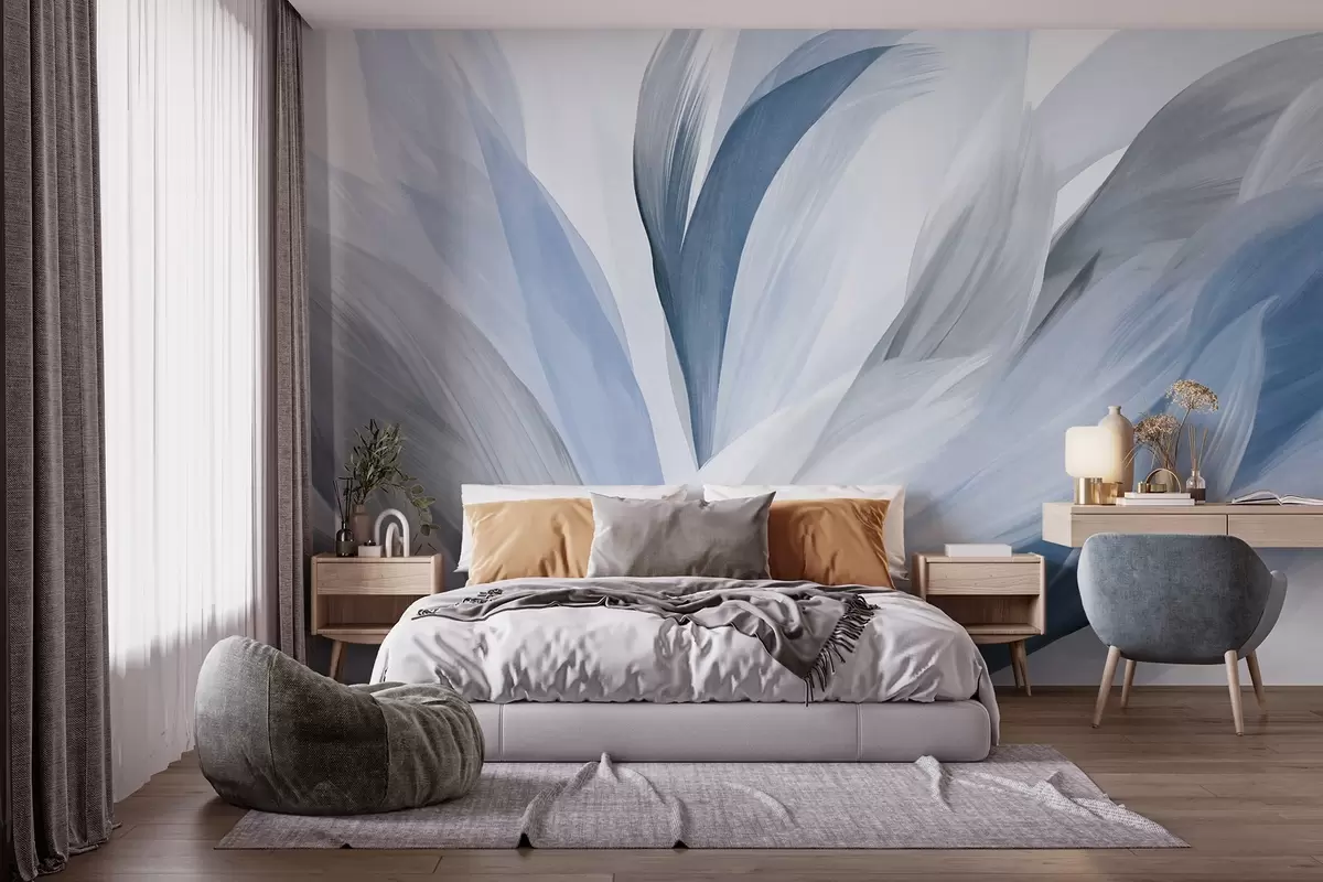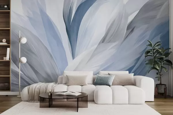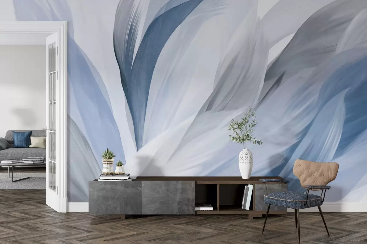 Τοιχογραφίες Αφηρημένα φτερά με υφή σε μπλε, λευκό και γκρι χρώμα και διάφορες αποχρώσεις, που επικαλύπτονται σε λευκό φόντο Nr. w09531v1