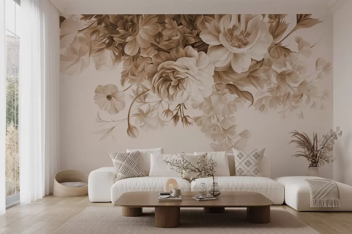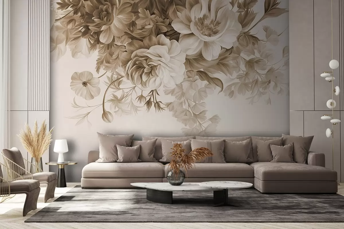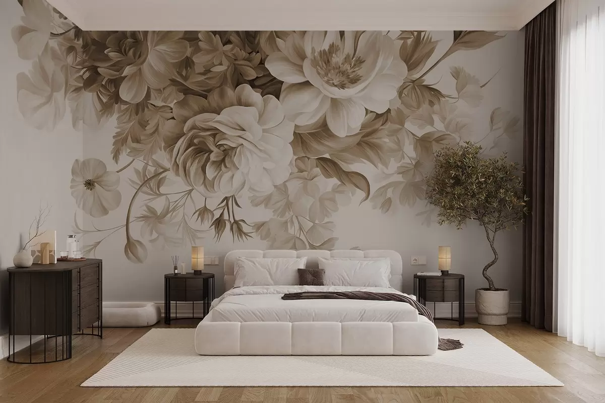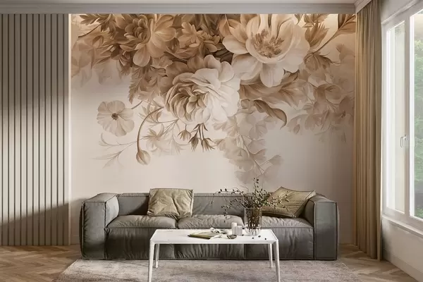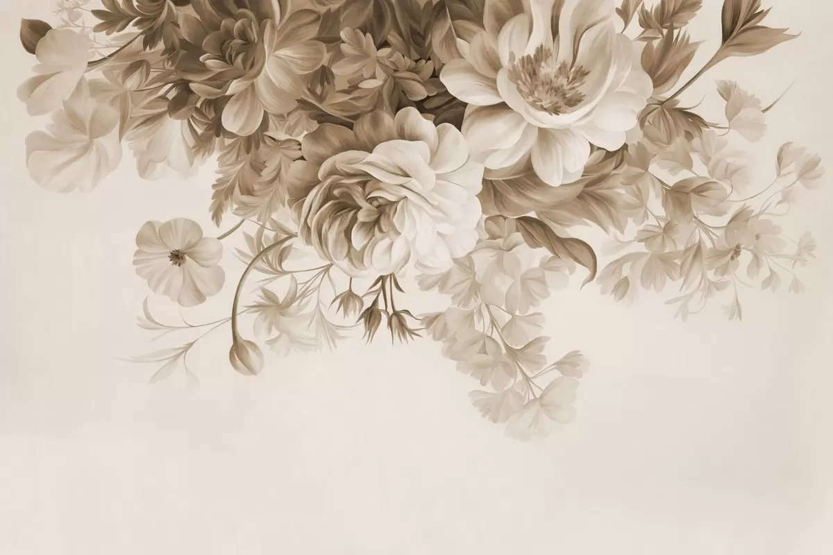 Τοιχογραφίες Vintage ανθοσύνθεση με τριαντάφυλλα, παιώνιες και άλλα λουλούδια με υφή και φύλλωμα, σε ανοιχτόχρωμο φόντο Nr. w09532v1