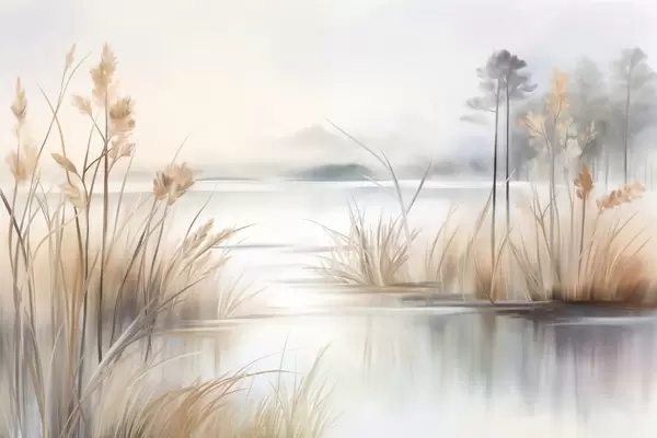 Τοιχογραφίες Τοπίο με λίμνη και ψηλό χορτάρι στο προσκήνιο, βουνά στο βάθος, απαλά χρώματα, υφή Nr. w09534