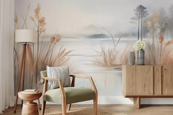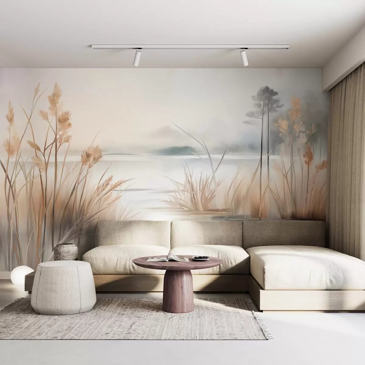 Τοιχογραφίες Τοπίο με λίμνη και ψηλό χορτάρι στο προσκήνιο, βουνά στο βάθος, απαλά χρώματα, υφή Nr. w09534