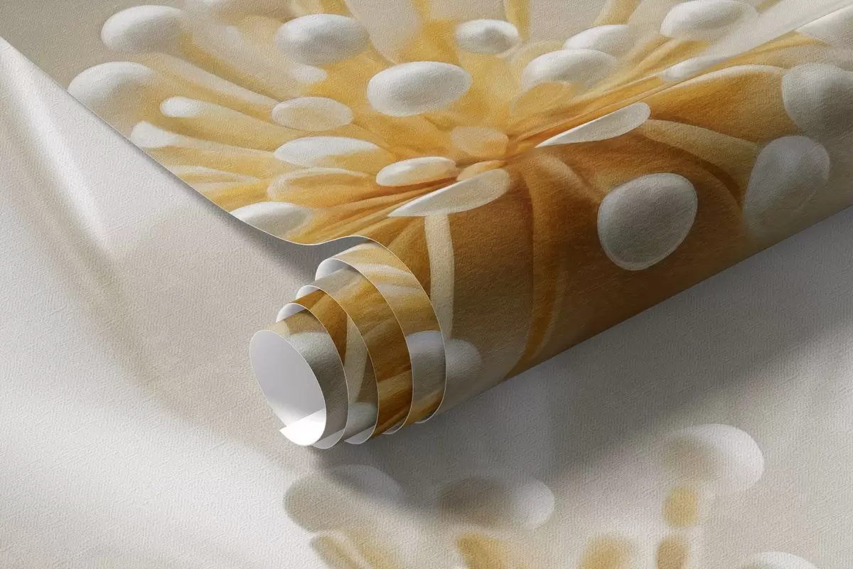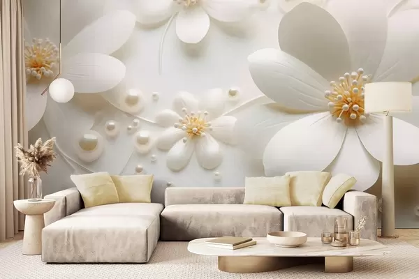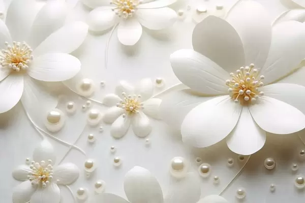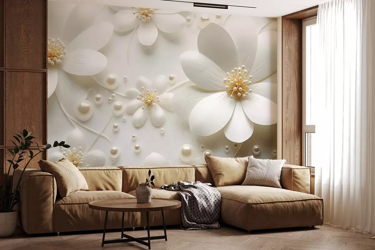 Τοιχογραφίες Λευκά λουλούδια με πέρλες διάσπαρτα σε λευκό φόντο, κομψό και μινιμαλιστικό σχέδιο, με υφή Nr. w09535