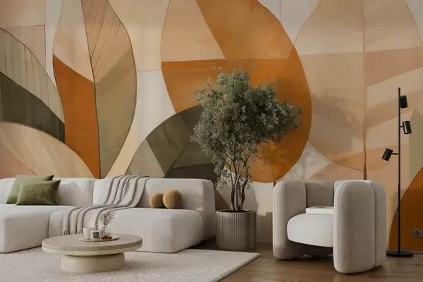 Τοιχογραφίες Αφηρημένα μεγάλα φύλλα σε αποχρώσεις του πορτοκαλί, καφέ και πράσινου, με υφή, διατεταγμένα σε ανοιχτόχρωμο φόντο Nr. w09539
