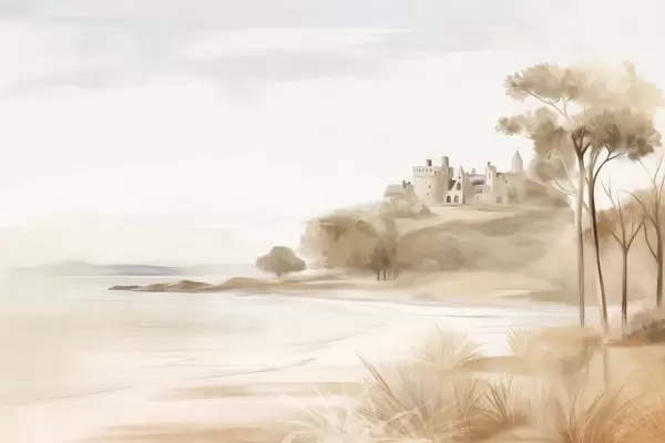 Τοιχογραφίες Τοπίο με ένα κάστρο σε ένα λόφο κοντά στη θάλασσα, μια αμμώδη παραλία στο προσκήνιο, απαλά χρώματα, τέχνη με υφή Nr. w09540