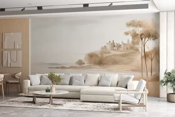Τοιχογραφίες Τοπίο με ένα κάστρο σε ένα λόφο κοντά στη θάλασσα, μια αμμώδη παραλία στο προσκήνιο, απαλά χρώματα, τέχνη με υφή Nr. w09540
