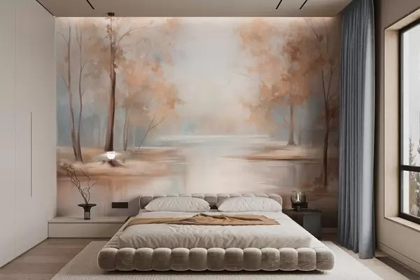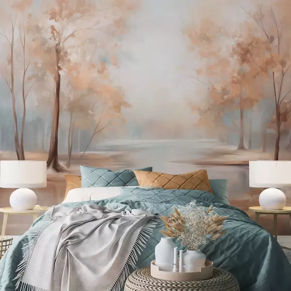 Τοιχογραφίες Φθινοπωρινό τοπίο με δέντρα και ποτάμι, απαλά χρώματα, ελαφριά και αέρινη ατμόσφαιρα, γαλήνια και ήρεμη σκηνή Nr. w09541