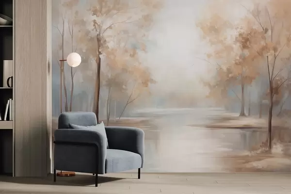 Τοιχογραφίες Φθινοπωρινό τοπίο με δέντρα και ποτάμι, απαλά χρώματα, ελαφριά και αέρινη ατμόσφαιρα, γαλήνια και ήρεμη σκηνή Nr. w09541