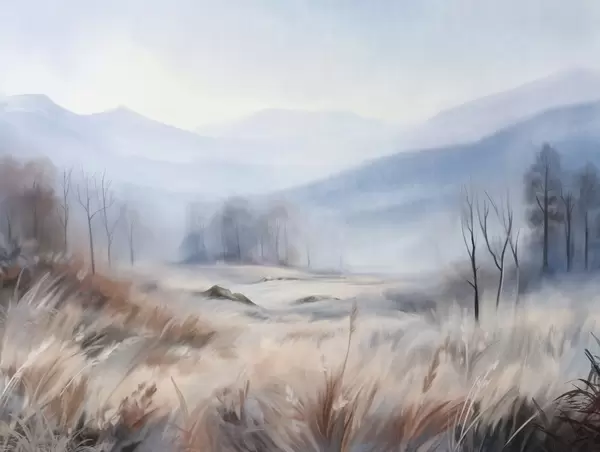 Τοιχογραφίες Υφή τοπίου με ξερά χόρτα στο προσκήνιο και δέντρα στο βάθος, με βουνά στο βάθος Nr. w09542