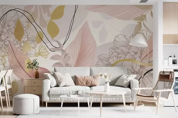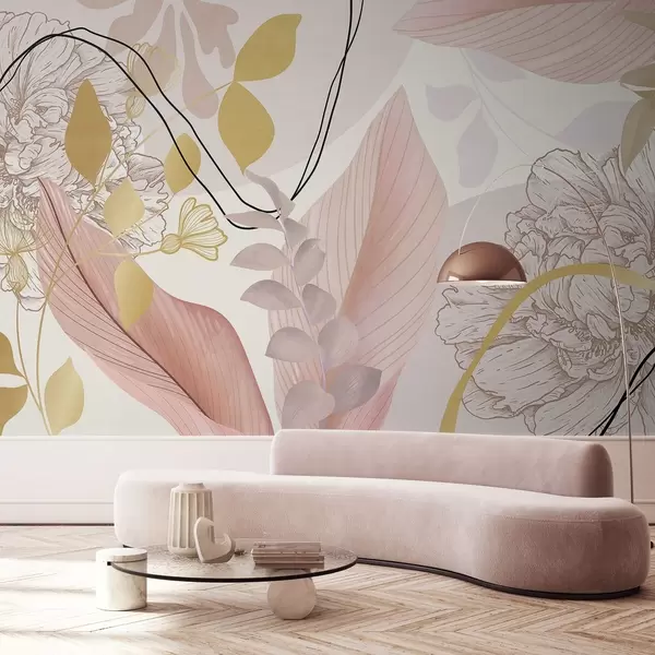 Τοιχογραφίες Αφηρημένο floral μοτίβο με μεγάλα φύλλα σε αποχρώσεις του απαλού ροζ, κίτρινου με λεπτές μαύρες γραμμές και λευκά floral περιγράμματα Nr. w09544v1