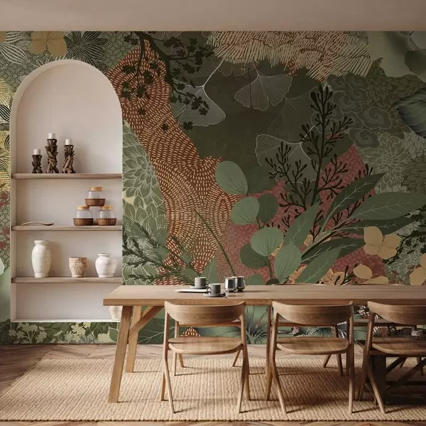 Τοιχογραφίες Αφηρημένο κολάζ με φυτικά στοιχεία, φύλλα, λουλούδια και οργανικές υφές, σε αποχρώσεις του πράσινου και του καφέ Nr. w09545