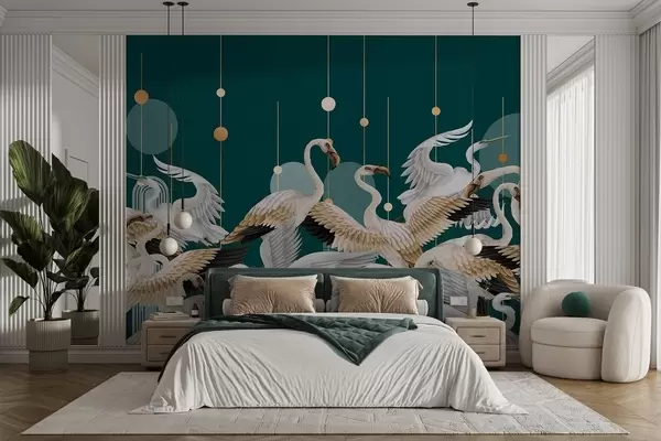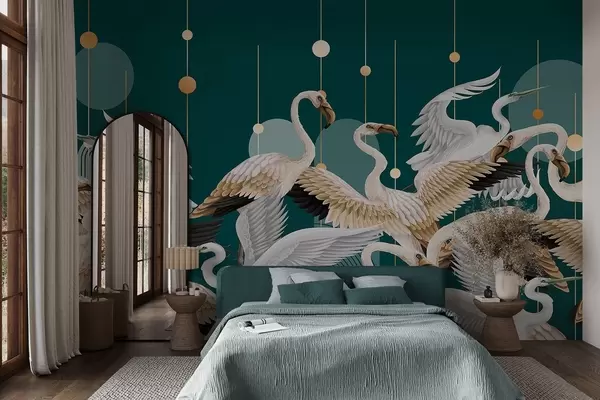 Τοιχογραφίες Ένα κοπάδι λευκών φλαμίνγκο με λεπτεπίλεπτα φτερά, σε σκούρο γαλαζοπράσινο φόντο με κίτρινες γραμμές και κύκλους. Nr. w09546
