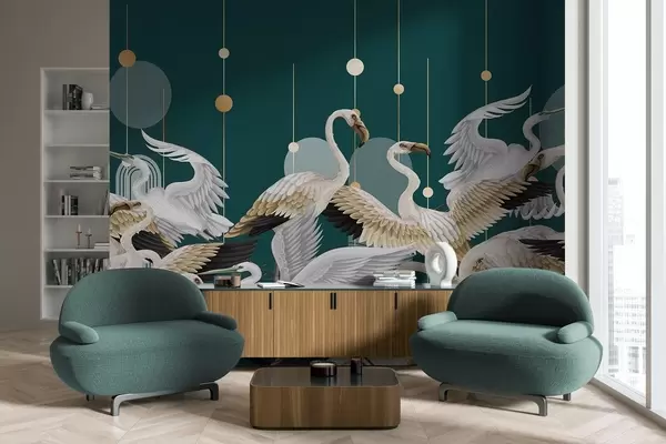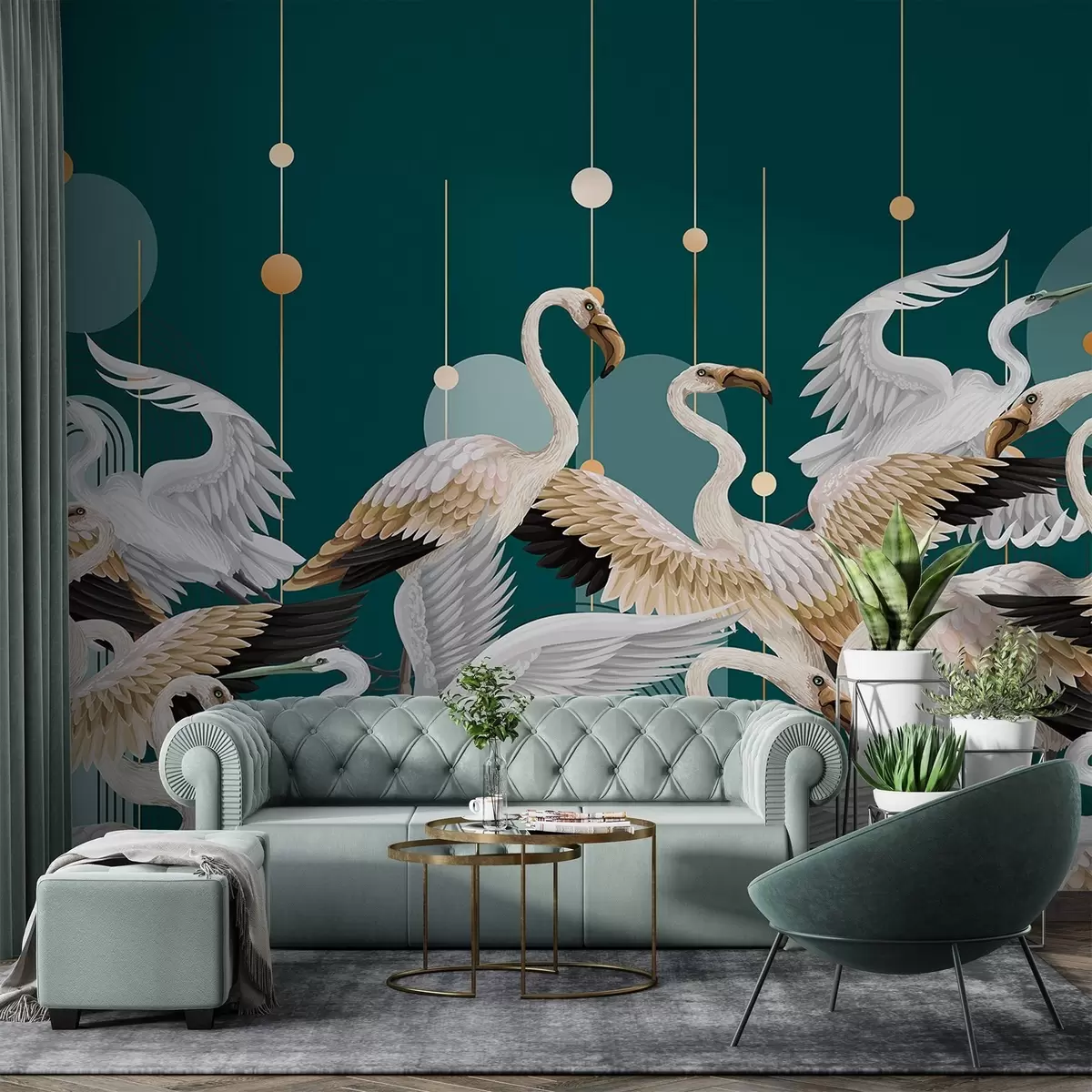 Τοιχογραφίες Ένα κοπάδι λευκών φλαμίνγκο με λεπτεπίλεπτα φτερά, σε σκούρο γαλαζοπράσινο φόντο με κίτρινες γραμμές και κύκλους Nr. w09546