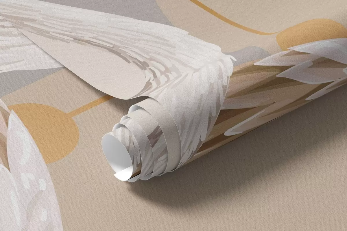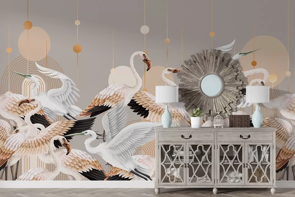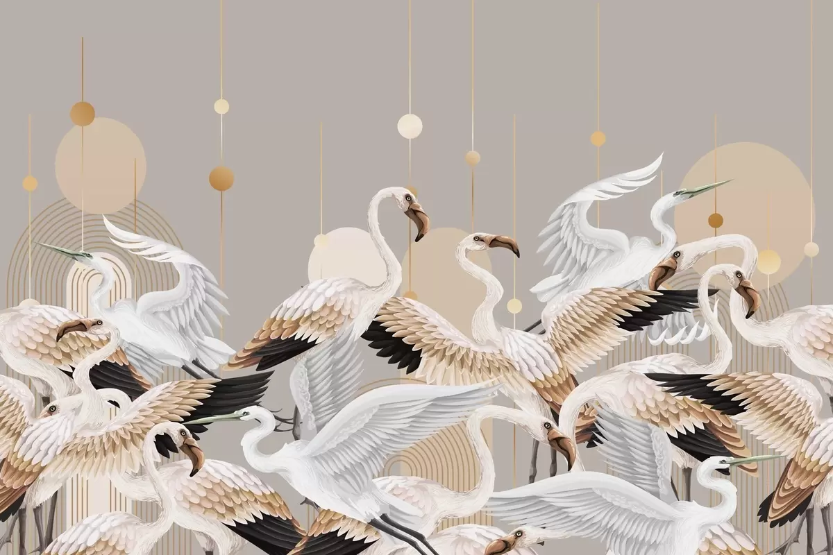 Τοιχογραφίες Ένα κοπάδι λευκών φλαμίνγκο με λεπτεπίλεπτα φτερά, σε ουδέτερο φόντο με κίτρινες γραμμές και κύκλους. Nr. w09546v1