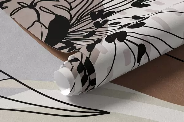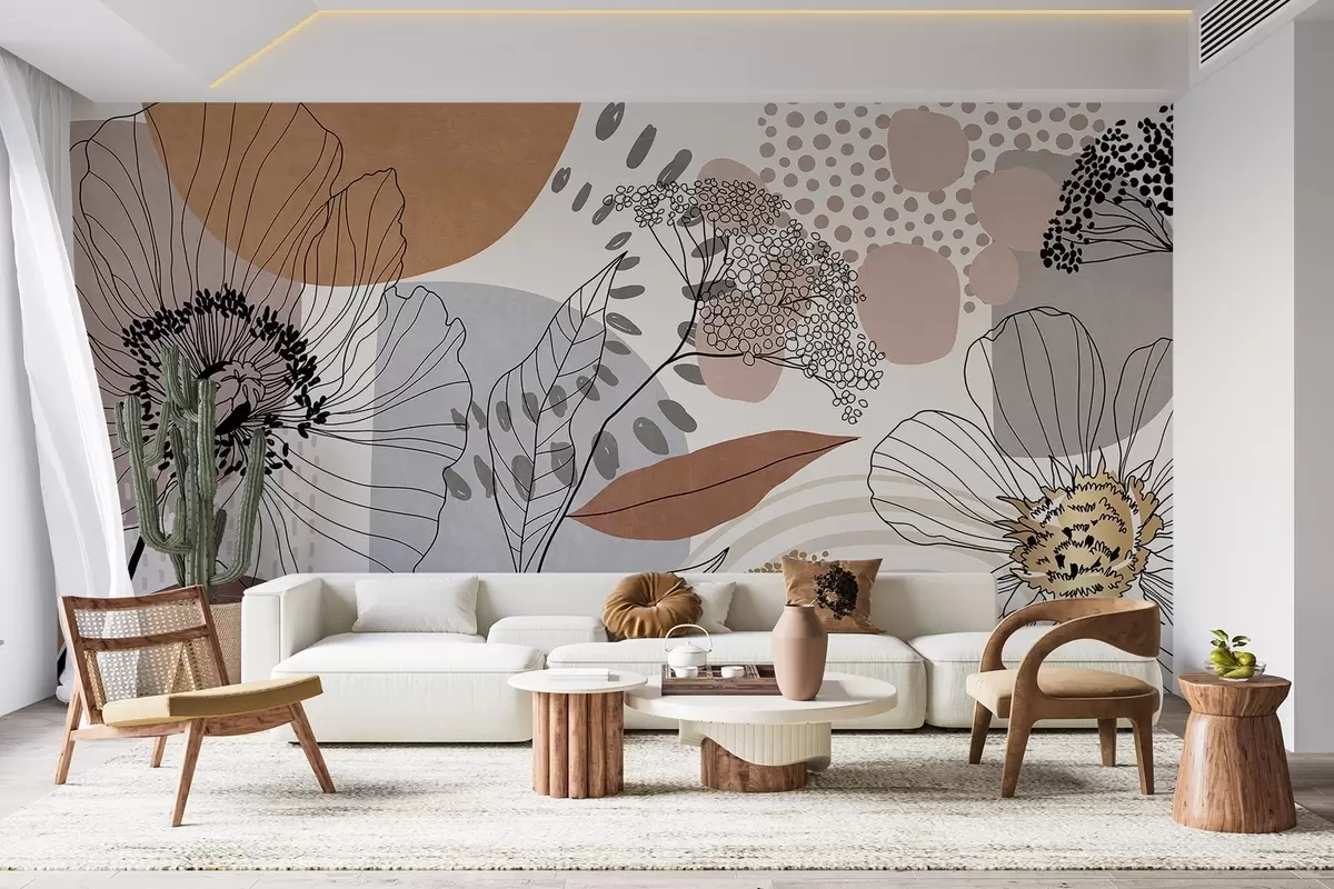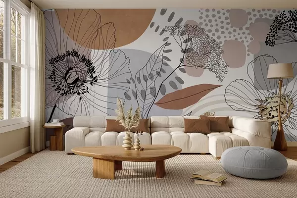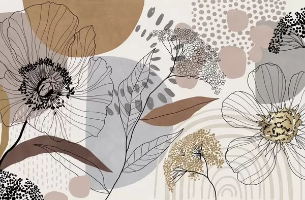 Τοιχογραφίες Αφηρημένο floral σχέδιο με λουλούδια, φύλλα και οργανικά σχήματα σε απαλούς καφέ, μπεζ και γκρι τόνους. Nr. w09548