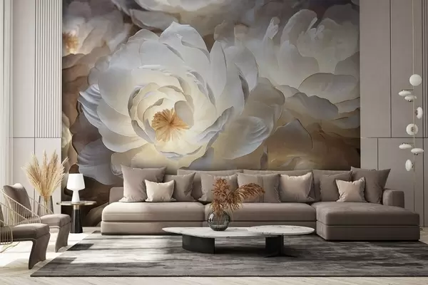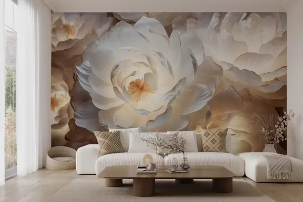 Τοιχογραφίες Μεγάλα, λευκά λουλούδια παιωνίας με κίτρινο κέντρο, απαλό φωτισμό και λεπτεπίλεπτα, υφασμάτινα πέταλα Nr. w09550