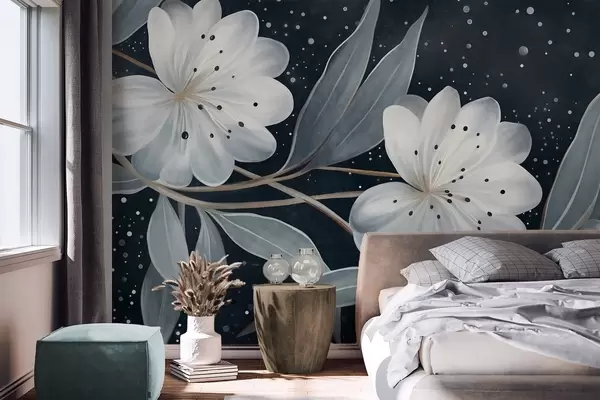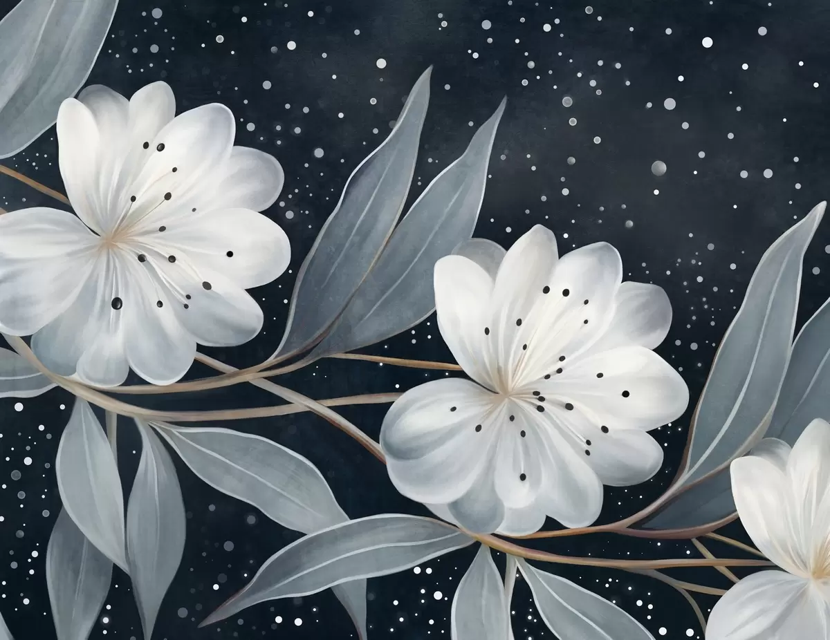 Τοιχογραφίες Φανταστικά λευκά λουλούδια με υφή, περιτριγυρισμένα από γαλαζοπράσινα φύλλα και κλαδιά σε σκούρο φόντο Nr. w09551