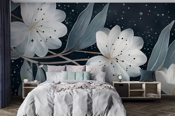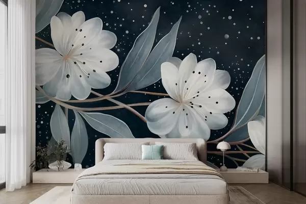 Τοιχογραφίες Φανταστικά λευκά λουλούδια με υφή, περιτριγυρισμένα από γαλαζοπράσινα φύλλα και κλαδιά σε σκούρο φόντο Nr. w09551