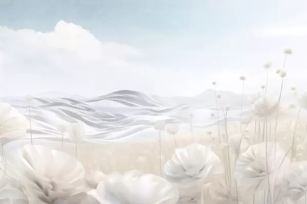 Τοιχογραφίες Πεδίο με κρεμώδεις παπαρούνες και κυματιστούς λόφους κάτω από ένα ανοιχτό μπλε ουρανό με απαλά σύννεφα, παστέλ χρώματα Nr. w09553