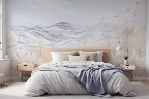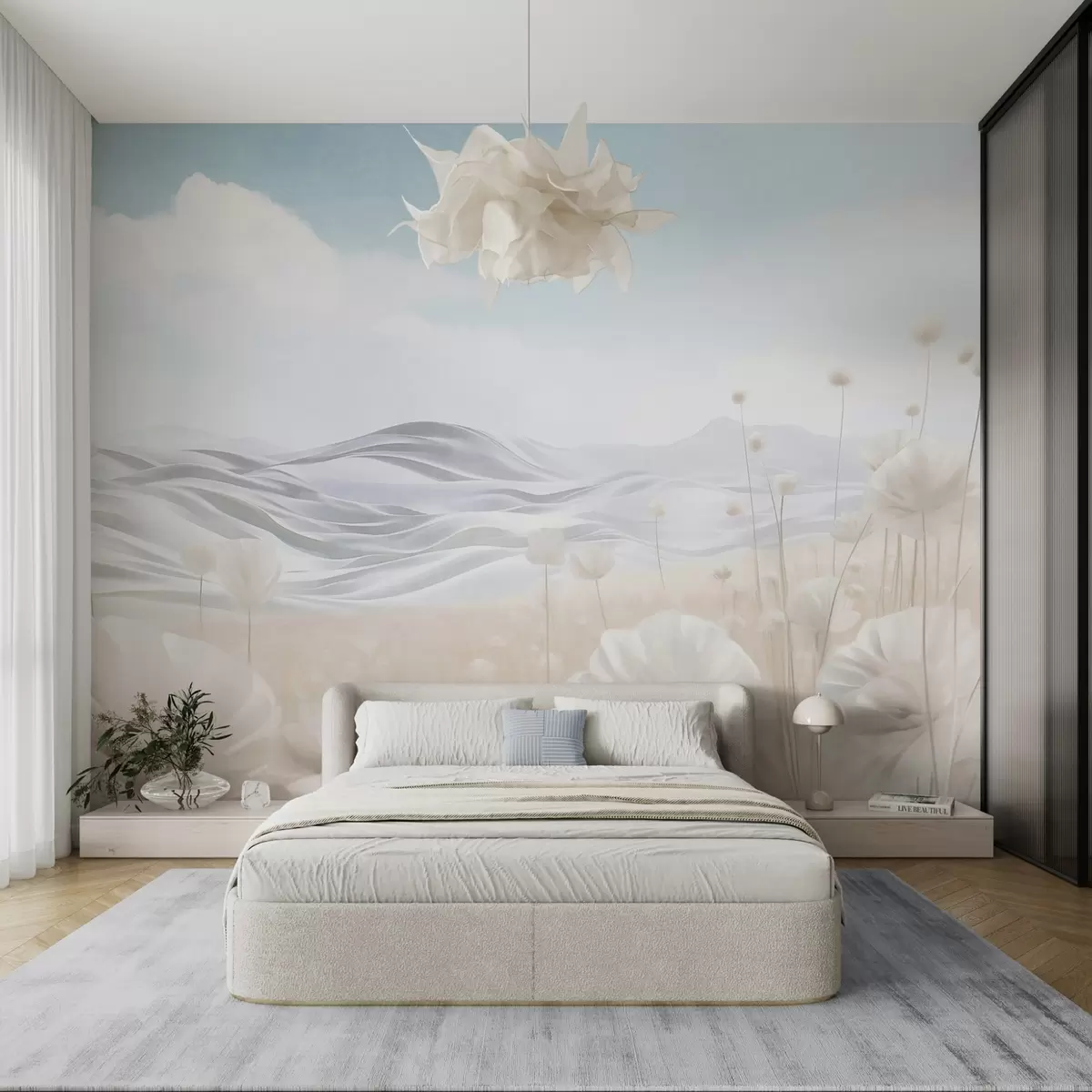 Τοιχογραφίες Πεδίο με κρεμώδεις παπαρούνες και κυματιστούς λόφους κάτω από ένα ανοιχτό μπλε ουρανό με απαλά σύννεφα, παστέλ χρώματα Nr. w09553