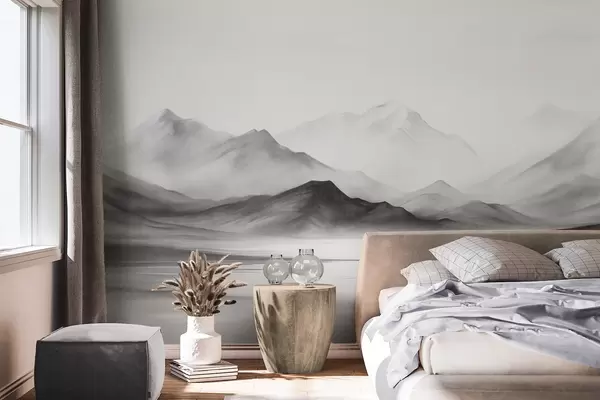 Τοιχογραφίες Μονοχρωματικό τοπίο με υφή, ομιχλώδη βουνά και μια λίμνη στο προσκήνιο Nr. w09555