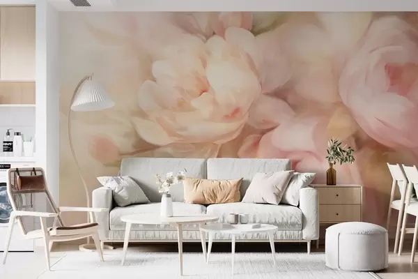 Τοιχογραφίες Αχνές ροζ και κρεμ παιονίες με απαλές, ζωγραφικές πινελιές, δημιουργώντας μια υφή με floral arrangement Nr. w09556