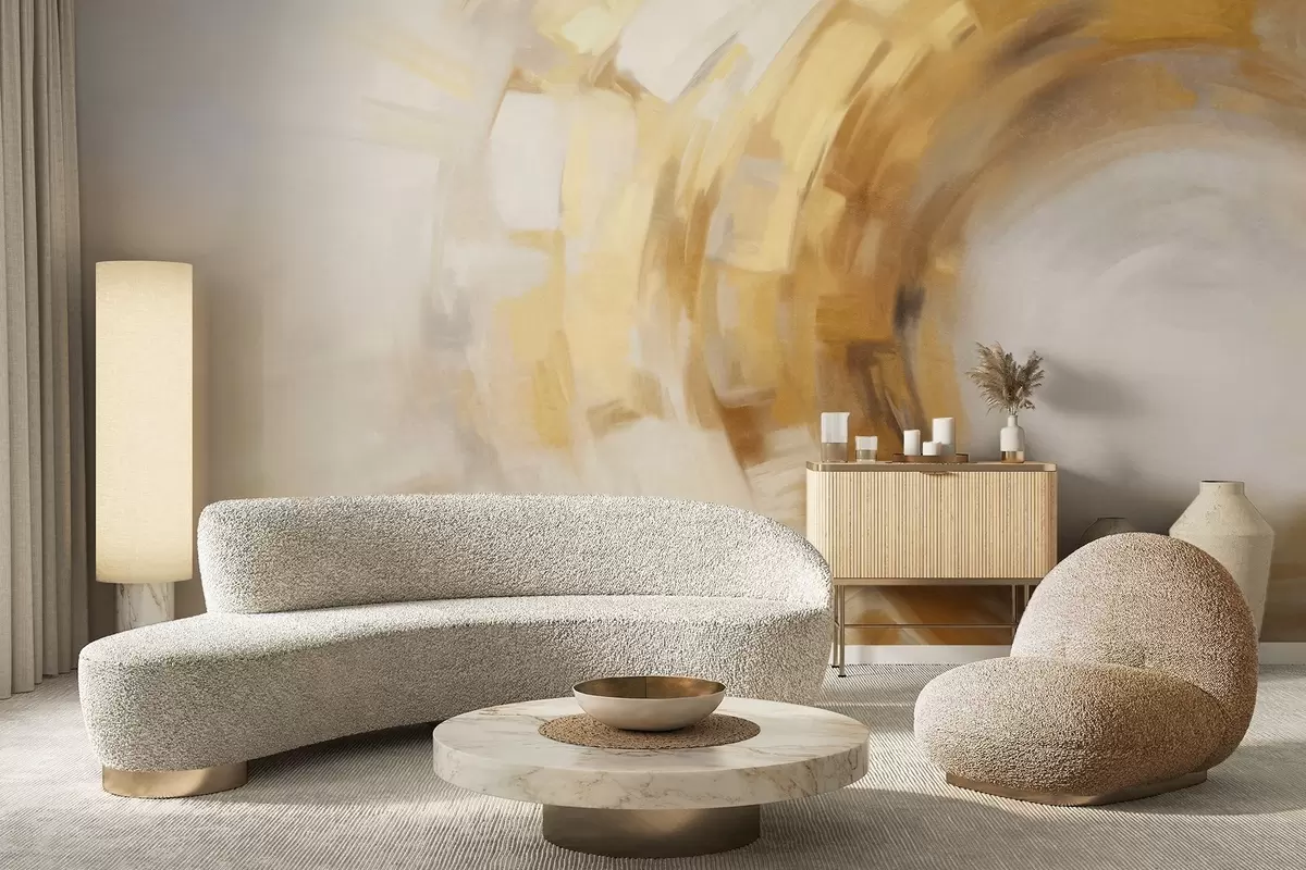 Τοιχογραφίες Αφηρημένη ζωγραφική με κυκλικές πινελιές σε κίτρινο και λευκό χρώμα, που δημιουργούν μια αίσθηση κίνησης. Nr. w09558