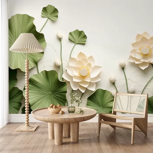 Τοιχογραφίες Τρισδιάστατα λουλούδια λωτού με πράσινα φύλλα με υφή, μινιμαλιστικό στυλ Nr. w09560