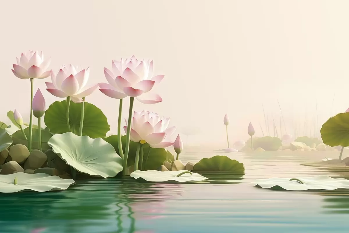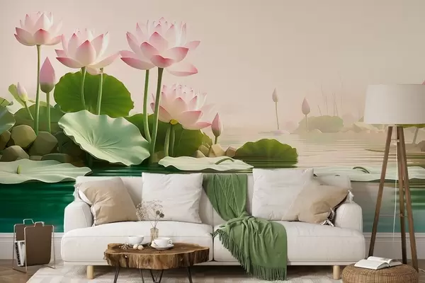 Τοιχογραφίες Ροζ λουλούδια λωτού στο νερό, ένα ήρεμο τροπικό τοπίο Nr. w09561