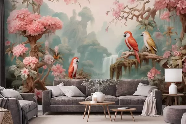 Τοιχογραφίες Ένα παραμυθένιο τροπικό δάσος με παπαγάλους, ανθισμένα δέντρα με ροζ άνθη και έναν καταρράκτη. Nr. w09580