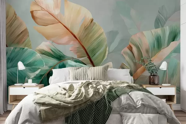 Τοιχογραφίες Λεπτά τροπικά φύλλα μπανανιάς σε παστέλ αποχρώσεις του κίτρινου και του πράσινου Nr. w09581