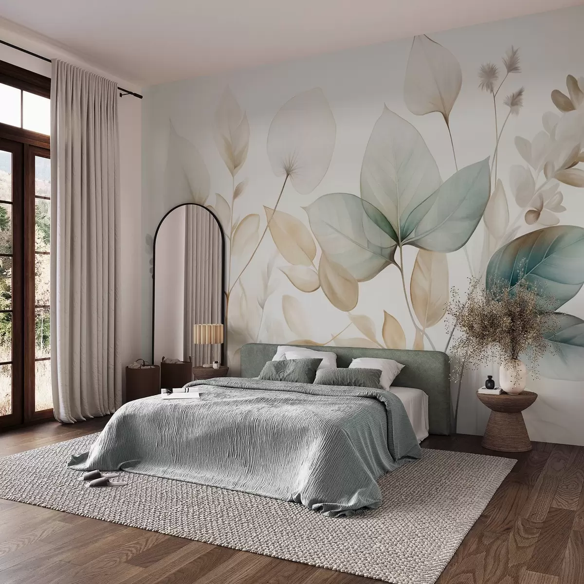 Τοιχογραφίες Διαφανή φύλλα με υφή σε απαλούς τόνους του μπεζ και του τυρκουάζ, με λεπτούς μίσχους σε απαλό, ανοιχτόχρωμο φόντο Nr. w09583