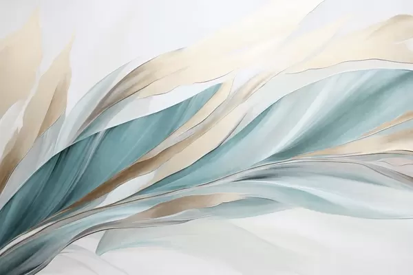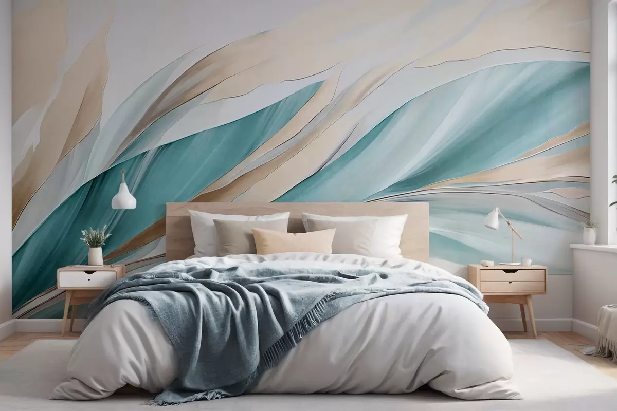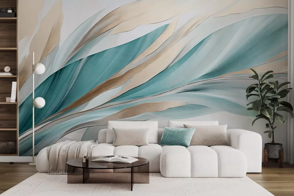 Τοιχογραφίες Αφηρημένα κυματιστά μοτίβα σε αποχρώσεις του γαλαζοπράσινου και του κίτρινου, με λεπτές γραμμές και σχήματα, σε λευκό φόντο, τέχνη με υφή Nr. w09585